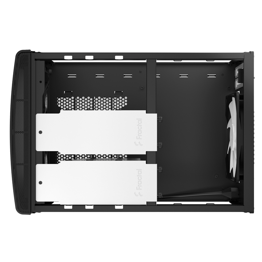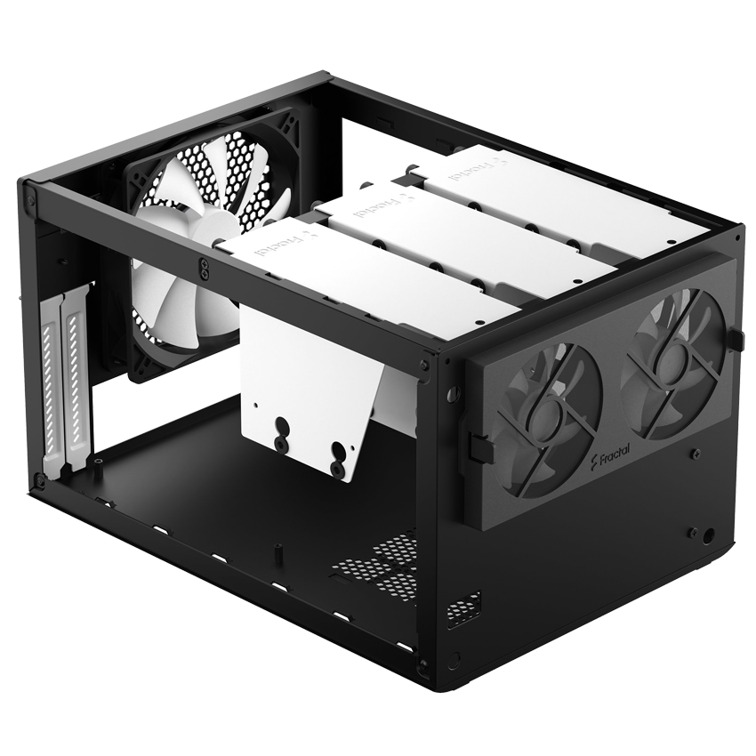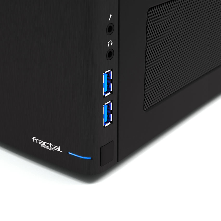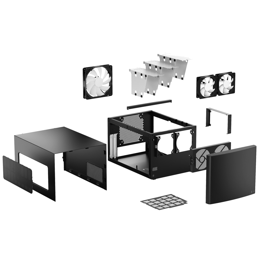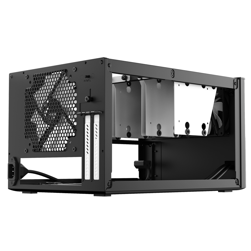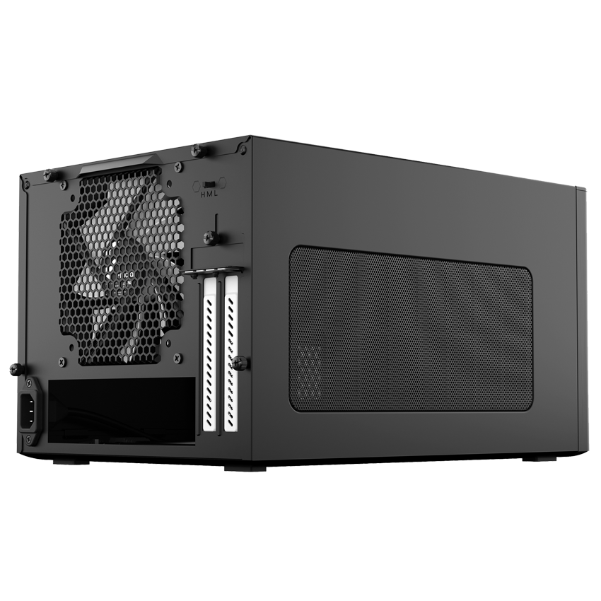 Boîtier format mini-cube très silencieux : 1 ventilateur 85 mm en face arrière + 1 ventilateur 120 mm en face avant.1 baie 5.25" (face avant), 2 baies d'extension (face arrière).