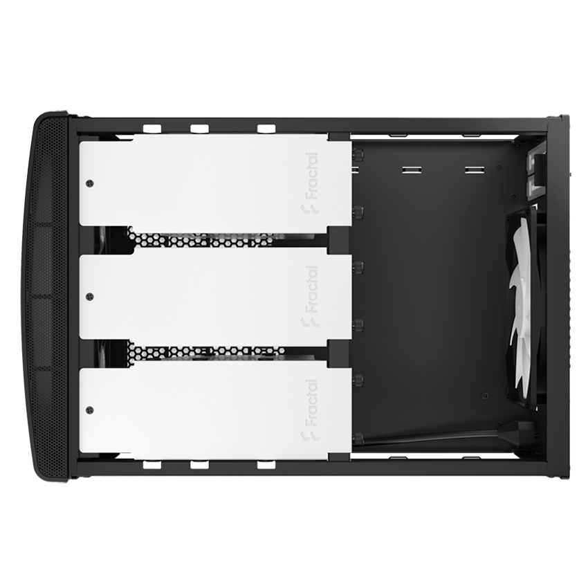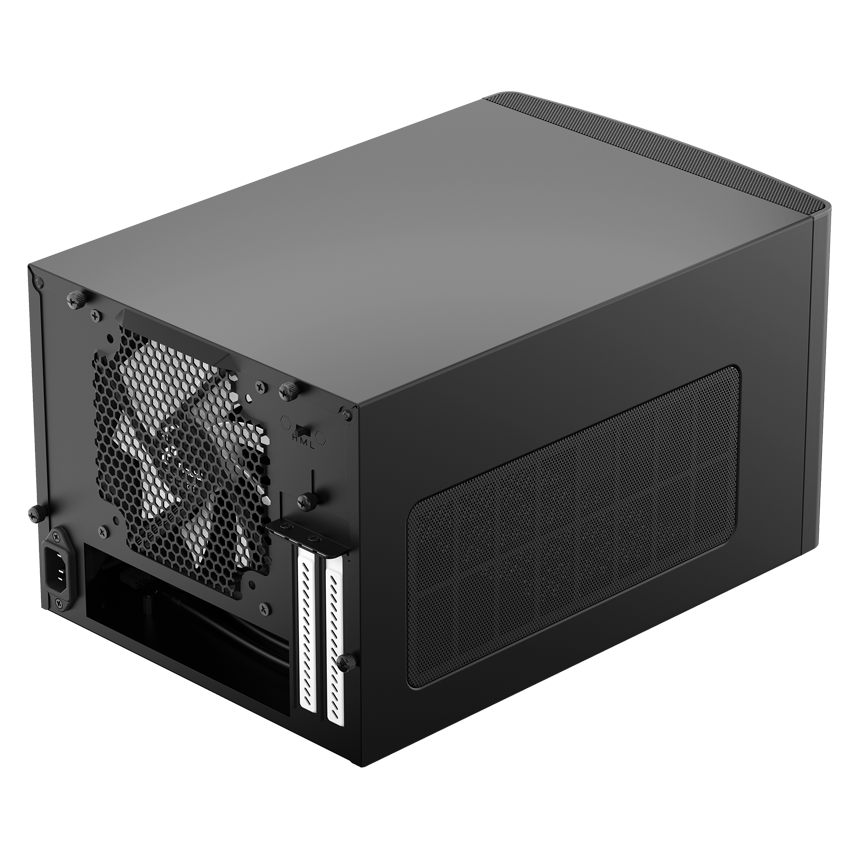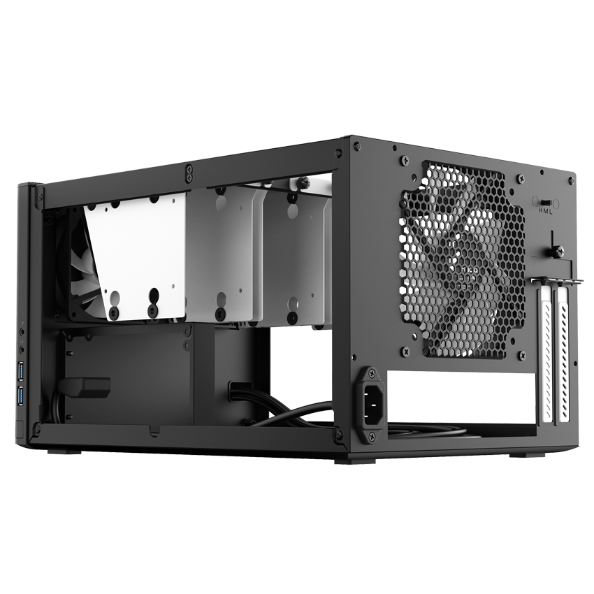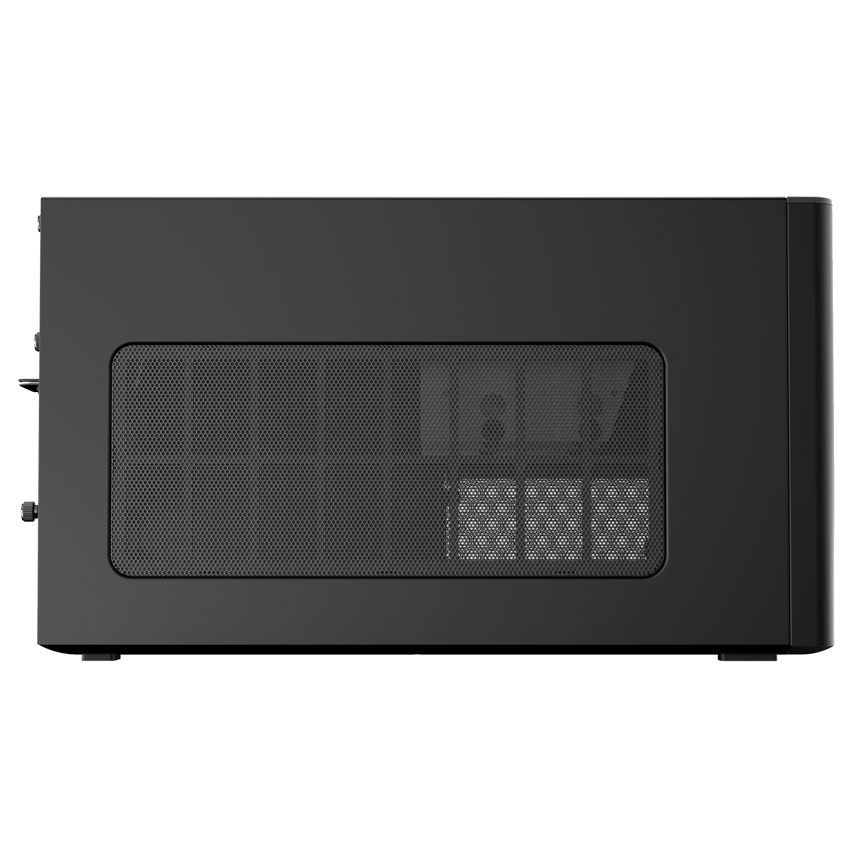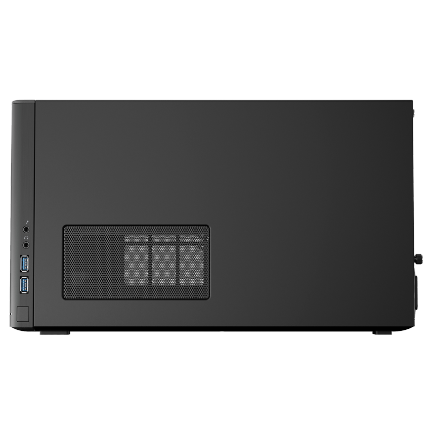Boîtier format mini-cube très silencieux : 1 ventilateur 85 mm en face arrière + 1 ventilateur 120 mm en face avant.1 baie 5.25" (face avant), 2 baies d'extension (face arrière).